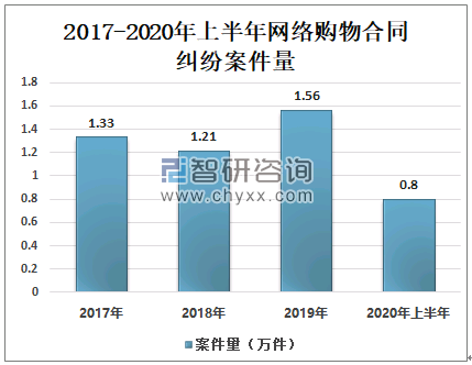 2017年以来,我国网络购物合同纠纷案件量呈波动走势,2017-2020年上半年网络购物合同纠纷案件量共计4.9万件,其中2017年案件量1.33万件;2018年案件量1.21万件,同比下降9.02%;2019年案件量1.56万件,同比增长28.93%;2020年上半年案件量0.8万件。