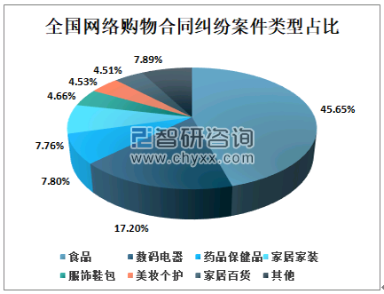 在网络购物合同纠纷案件类型中,其中食品类纠纷占比最高,为45.65%;其次是数码电器类、保健医药类、家具家装类、服饰鞋包类、美妆个护类、家居百货类,占比共计46.46%;其它品类合计占比7.89%。