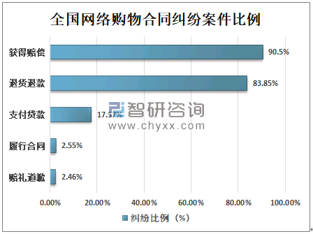 在网络购物合同纠纷案件中,90.5%的原告要求获得赔偿,83.85%的原告要求退货退款,17.57%的原告要求被告支付货款,2.55%的原告要求被告履行合同,2.46%的原告要求被告赔礼道歉。