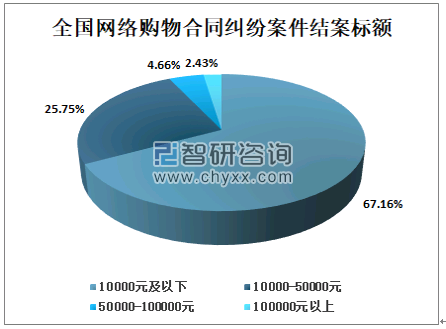 在网络购物合同纠纷案件中,纠纷案件结案标的额在10000元及以下的占比67.16%;10000-50000元的占比25.75%;50000-100000元的占比4.66%,100000元以上的占比2. 43%。