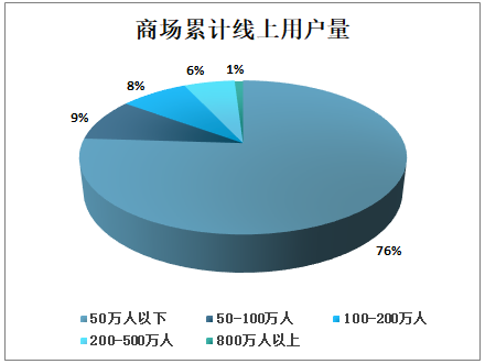 商场线上营销已经普及,其中累计用户量在50万人以下的企业占比76%;累计用户量在50 -100万人的企业占比9%;累计用户量在100-200万人的企业占比8%;累计用户量在200-500万人企业占比6%。