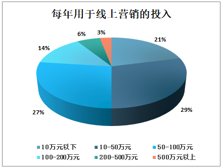 从线上营销投入上看,线上营销费用投入在10万以下的企业占比21%;投入在10-50万元的企业占比29%;投入在50-100万元的企业占比27%;投入在100-500万以上的企业共占比23%。