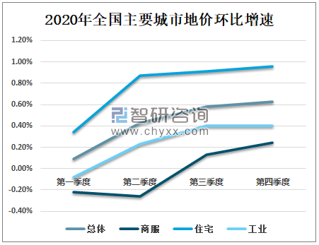 从环比看,2020年全国城市地价水平整体呈持续上升趋势,第四季度总体环比增速为0.63%,其中商服、住宅环比增速持续上涨,增速分别是0.24%、0.96%;工业环比增速与上季度保持持平,增速均为0.4%。