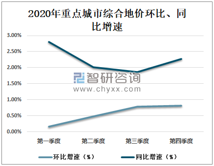 2020年重点城市综合地价环比增速为0.82%,其中商服、住宅、工业地价环比增速分别是 0.25%、1.16%和 0.60%;重点城市综合地价同比增速为2.28%,其中商服、住宅、工业地价同比增速分别是0.43%、3.46%和1.45%。