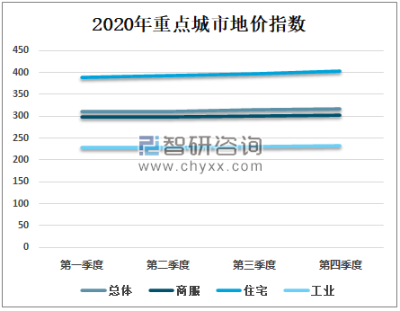 2020年我国重点城市地价指数保持上升趋势,第四季度综合、商服、住宅、工业平均地价指数分别为318、302、404、233,较上一季度分别上涨4、2、7、2个点。