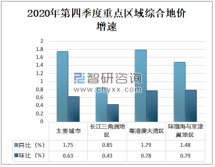 从环比看,2020年第四季度长江三角洲地区、粤港澳大湾区、环渤海与京津冀地区综合地价环比增速分别为0.43%、0.78%、0.79%;从同比看,长江三角洲地区、粤港澳大湾区、环渤海与京津冀地区综合地价同比增速分别为0.85%、1.79%、1.48%。
