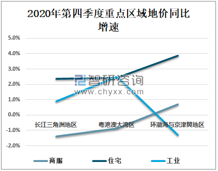 2020年第四季度长江三角洲地区商服、住宅、工业地价同比增速分别是-1.4%、2.36%、0.9%;粤港澳大湾区商服、住宅、工业地价同比增速分别是-0.88%、2.43%、2.51%;环渤海与京津冀地区商服、住宅、工业地价同比增速分别是0.7%、3.87%、-1.31%。