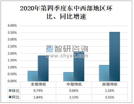 2020 年第四季度全国东部、中部、西部地区综合地价环比增速分别是0.74%、0.66%、1.16%;东部、中部、西部地区综合地价同比增速分别是1.84%、2.13%、3.55%。