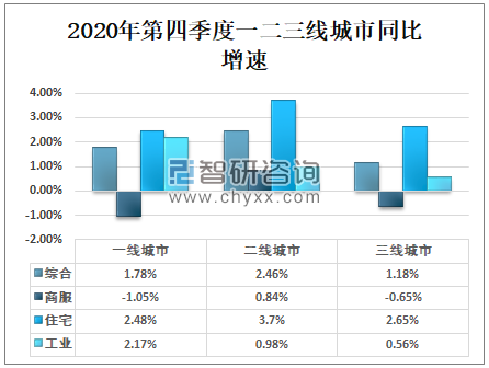 2020年第四季度我国一线城市综合、商服、住宅、工业地价同比增速分别是1.78%、-1.05%、2.48%、2.17%;二线城市综合、商服、住宅、工业地价同比增速分别是2.46%、0.84%、3.7%、0.98%;三线城市综合、商服、住宅、工业地价同比增速分别是1.18%、-0.65%、2.65%、0.56%。