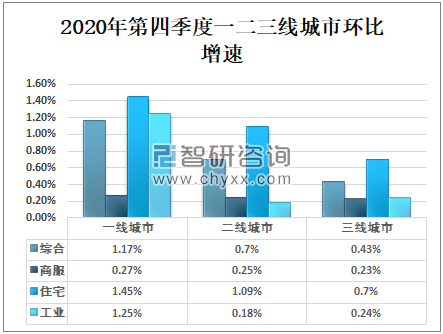 2020年第四季度我国一线城市综合、商服、住宅、工业地价环比增速分别是1.17%、0.27%、1.45%、1.25%;二线城市综合、商服、住宅、工业地价环比增速分别是0.7%、0.25%、1.09%、0.18%;三线城市综合、商服、住宅、工业地价环比增速分别是0.43%、0.23%、0.7%、0.24%。