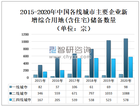 2015-2020年中国各线城市主要企业新增综合用地(含住宅)储备数量