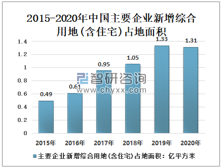 土地增值有效地促进了土地的节约、集约利用和房地产市场的协调发展,2015-2019年中国主要企业新增综合用地(含住宅)占地面积逐年增长,2020年因疫情影响有所下降,2020年中国主要企业新增综合用地(含住宅)占地面积1.31亿平方米,同比下降1.50%。