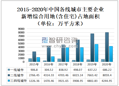 2015-2020年中国各线城市主要企业新增综合用地(含住宅)占地面积(单位:万平方米)