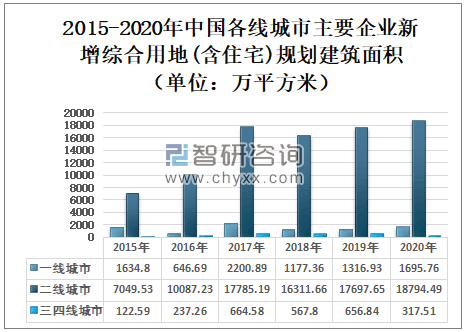2015-2020年中国各线城市主要企业新增综合用地(含住宅)规划建筑面积