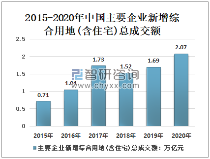 城市土地的功能决定了其用途的多样性,从最近全国新增综合用地的总成交额看,2020年,中国主要企业新增综合用地(含住宅)总成交额没有受疫情的影响,反而出现增长,主要企业新增综合用地(含住宅)总成交额2.07万亿元,同比增长22.49%。