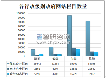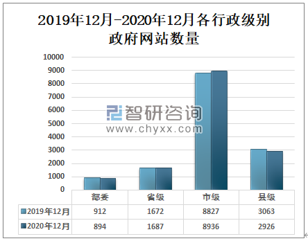 智研咨询发布的《2021-2027年中国政府网站行业市场研究分析及投资战略规划报告》数据显示:截至2020年12月,部委(国务院组织机构)共有政府网站894个,占总体政府网站的6.2%;省级单位共有政府网站1687个,占总体政府网站的11.68%;市级单位共有政府网站8936,占总体政府网站的61.87%;县级单位共有政府网站2926个,占总体政府网站的20.26%。