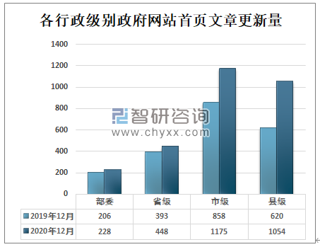 2020年各行政级别政府网站首页文章更新量均有所增长,到2020年末总量达2905万篇,较上年增加828篇,同比增长39.9%;其中县级政府网站首页文章更新量增幅最高,达70.1%。