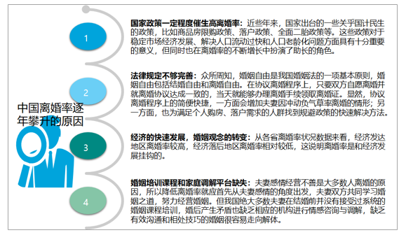 中国离婚率逐年攀升的原因主要有:经济的快速发展,婚姻观念的转变;国家政策一定程度催生高离婚率;法律规定不够完善;婚姻培训课程和家庭调解平台缺失等。