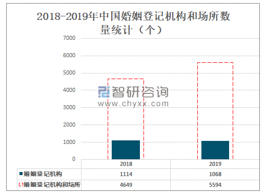 2019年中国共有婚姻登记机构和场所5594个,较2018年增加了945个,其中婚姻登记机构1068个,较2018年减少了46个。