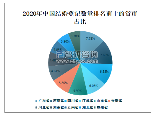 2020年中国结婚登记数量排名前十的省市占比