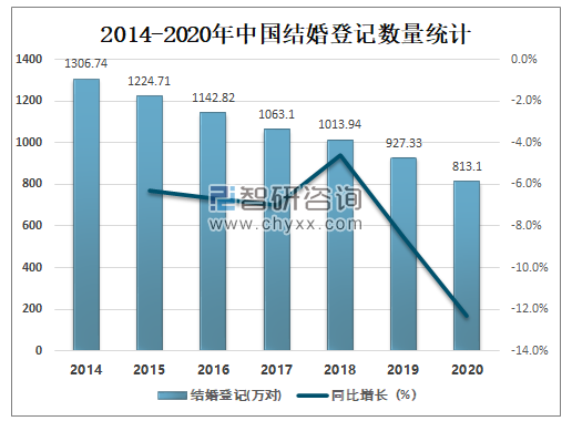 近年来中国结婚登记数量逐年减少,2020年中国共办理结婚登记813.1万对,较2019年减少了114万对,同比减少12.3%。