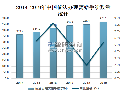 改革开放以来,中国经济社会快速发展,城镇化水平不断提高,人民生活水平不断改善。与此同时,也呈现一个显著的社会问题:离婚的人越来越多,离婚对数也逐年增加。2019年中国依法办理离婚手续数量达470.06万对,较2018年增加了23.98万对,同比增长5.4%。