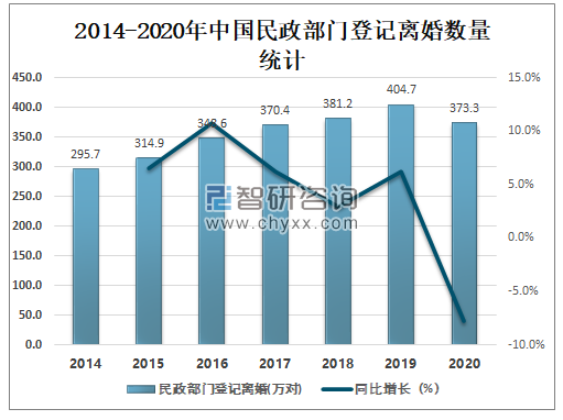 近年来中国民政部门登记离婚数量逐年攀升,2020年受新冠肺炎疫情影响有所下滑,2020年中国民政部门登记离婚数量为373.3万对,较2019年减少了31.4万对,同比减少7.8%。