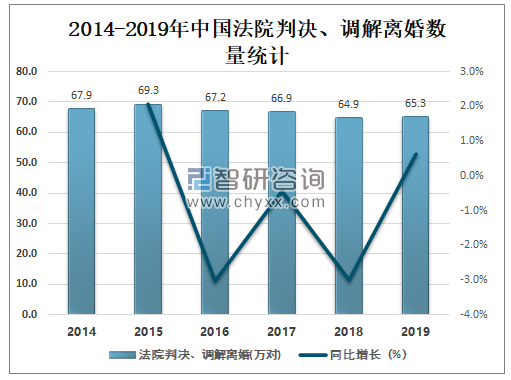 中国法院判决、调解离婚数量逐年减少,2019年中国法院判决、调解离婚数量为65.3万对,较2018年减少了0.4万对,同比减少0.6%。