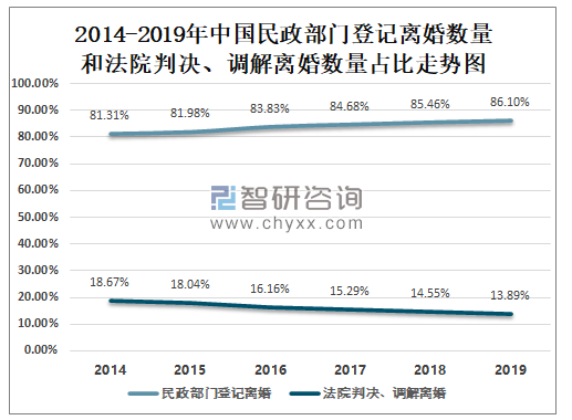 中国民政部门登记离婚数量占依法办理离婚手续数量的比例逐年增加,2019年中国民政部门登记离婚数量占依法办理离婚手续数量的86.10%,较2018年增长了13.89%。中国法院判决、调解离婚数量占依法办理离婚手续数量的比例逐年减少,2019年中国法院判决、调解离婚数量占依法办理离婚手续数量的0.6%,较2018年减少了0.7%。