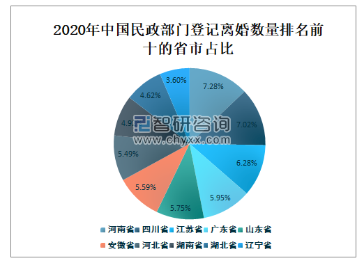 2020年河南省民政部门办理离婚登记数量占全国民政部门登记离婚总数量7.28%,占比最大;四川省民政部门办理离婚登记数量占全国民政部门登记离婚总数量7.02%;江苏省民政部门办理离婚登记数量占全国民政部门登记离婚总数量6.28%;广东省民政部门办理离婚登记数量占全国民政部门登记离婚总数量5.95%;山东省民政部门办理离婚登记数量占全国民政部门登记离婚总数量5.75%。