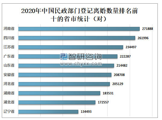 2020年河南省民政部门共办理离婚登记271888对,全国排名第一;四川省民政部门共办理离婚登记261996对,全国排名第二;江苏省民政部门共办理离婚登记234497对,全国排名第三。