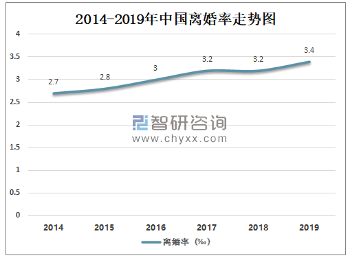 近年来国离婚率逐年攀升,2019年中国离婚率达3.4‰,较2018年增长了0.2‰。