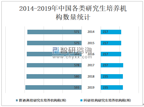智研咨询发布的《2021-2027年中国研究生教育行业市场研究分析及投资战略规划报告》数据显示:2019年中国共有普通高校研究生培养机构数593所,较2018年增加了13所;2019年中国共有科研机构研究生培养机构数235所,与2018年持平。