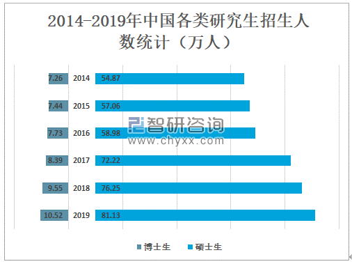 2019年中国博士研究生招生人数为10.52万人,较2018年增加了0.97万人;硕士生研究生招生人数为81.13万人,较2018年增加了4.88万人。
