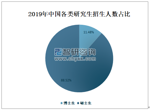 2019年博士研究生招生人数占研究生招生总人数的11.48%,占比较小;硕士研究生招生人数占研究生招生总人数的88.52%,占比非常大。