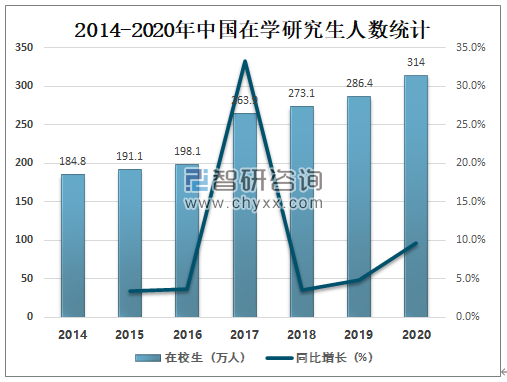 中国在学研究生人数逐年增加,2020年中国在学研究生人数达314万人,较2019年增加了27.6万人,同比增长9.6%。