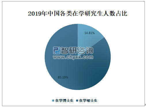 2019年中国在学博士生人数占在学研究生总人数的14.81%,占比较小;在学硕士生人数占在学研究生总人数的85.19%,占比较大。