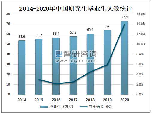 2020年中国研究生毕业生人数达72.9万人,较2019年增加了8.9万人,同比增长13.9%,预计未来将继续保持增长趋势。