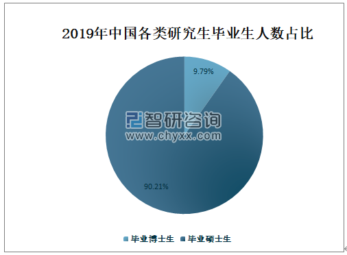 2019年中国毕业博士生人数占研究生毕业生总人数的9.79%,占比较小;毕业硕士生人数占研究生毕业生总人数的90.21%,占比非常大。