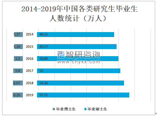 2019年中国毕业博士生人数为6.26万人,较2018年增加了0.19万人;毕业硕士生人数为57.71万人,较2018年增加了3.35万人。