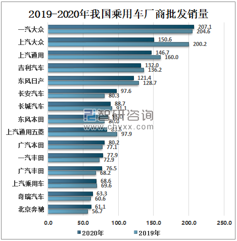我国汽车市场销量呈现连续两年下降后稳步回升态势。2020年国产狭义乘用车全年批发销量达1976.3万辆,同比下降6.3%。其中一汽大众批发销量207.1万辆,较2019年增加2.5万辆,同比增长1.2%;上汽大众批发销量150.6万辆,较2019年减少49.6万辆,同比下降24.8%;上汽通用批发销量146.7万辆,较2019年减少13.3万辆,同比下降8.3%。