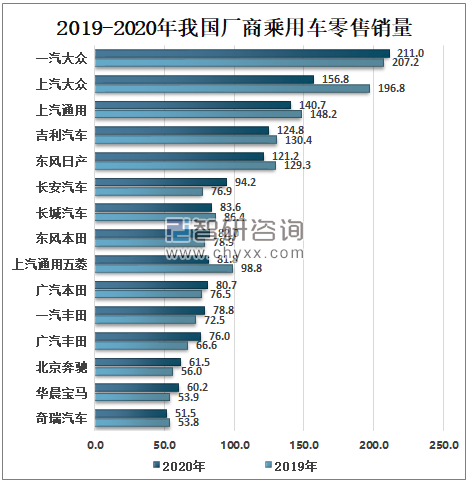 2020年我国厂商乘用车零售销量累计达1928.8万辆,同比下降6.8%。前五家企业销量均突破100万辆,其中一汽大众突破200万辆。一汽大众、上汽大众和上汽通用仍是国内狭义乘用车零售销量的前三,零售销量分别是211万辆、156.8万辆、140.7万辆。