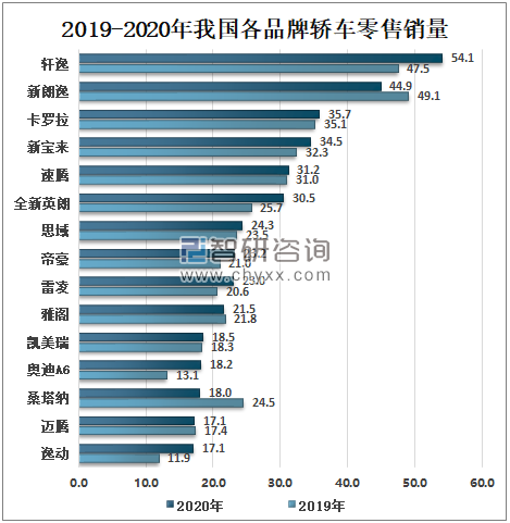 2020年全年我国各品牌轿车零售销量累计925.0万辆,同比下降8.8%。其中轩逸零售销量54.1万辆,较上年增加6.6万辆,同比增长13.9%;新朗逸零售销量44.9万辆,较上年减少4.2万辆,同比下降8.5%;卡罗拉零售销量35.7万辆,较上年增加0.6万辆,同比增长1.8%。