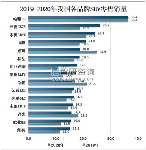 2020年全年我国各品牌SUV零售销量累计894.8万辆,同比下降2.4%。其中哈弗H6零售销量36.4万辆,与上年持平;长安CS75零售销量26.2万辆,较上年增加7.3万辆,同比增长38.9%;本田CR-V零售销量24.3万辆,较上年增加3.2万辆,同比增长15.1%。
