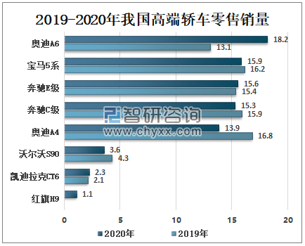 智研咨询发布的《2021-2027年中国汽车行业竞争格局分析及投资前景规划报告》数据显示:2020年我国高端轿车零售销量排名前三的奥迪A6、宝马5系、奔驰E级,其中奥迪A6零售销量18.2万辆,较上年增加5.1万辆,同比增长38.8%;宝马5系零售销量15.9万辆,较上年减少0.3万辆,同比下降1.8%;奔驰E级零售销量15.6万辆,较上年增加0.2万辆,同比增长1.1%。