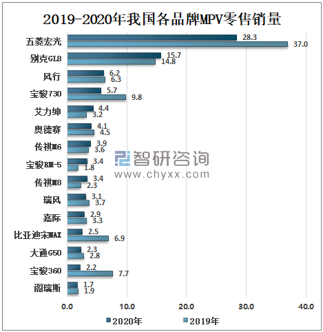 2020年全年我国各品牌MPV零售销量累计109.0万辆,同比下降20.8%。其中五菱宏光零售销量28.3万辆,较上年减少8.6万辆,同比下降23.3%;别克GL8零售销量15.7万辆,较上年增加0.9万辆,同比增长6.2%;风行零售销量6.2万辆,较上年减少0.2万辆,同比下降2.5%。