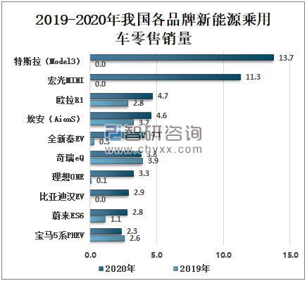 2020年全年我国各品牌新能源乘用车零售销量累计110.9万辆,同比增长9.8%,其中特斯拉(Model 3)零售销量13.7万辆;宏光MINI零售销量11.3万辆;欧拉R1零售销量4.7万辆,较上年增加1.9万辆,同比增长64.1%。