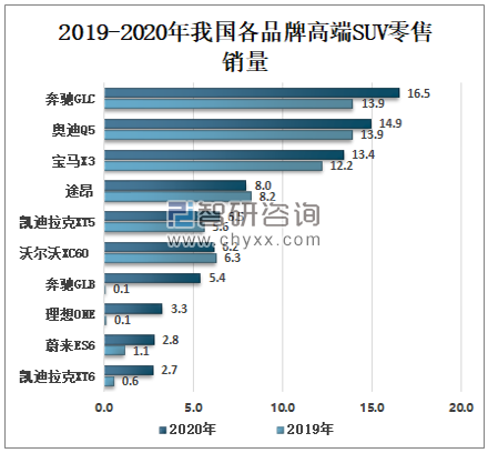 2020年我国各品牌高端SUV零售销量排名前三的是奔驰GLC、奥迪Q5、宝马X3,其中奔驰GLC零售销量16.5万辆,较上年增加2.6万辆,同比增长18.5%;奥迪Q5零售销量14.9万辆,较上年增加1.0万辆,同比增长7.3%;宝马X3零售销量13.4万辆,较上年增加1.2万辆,同比增长9.9%。