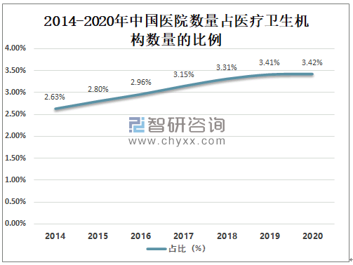 中国医院数量占医疗卫生机构数量的比例逐年攀升,2020年中国医院数量占医疗卫生机构数量的3.42%,较2019年增长了0.012%。