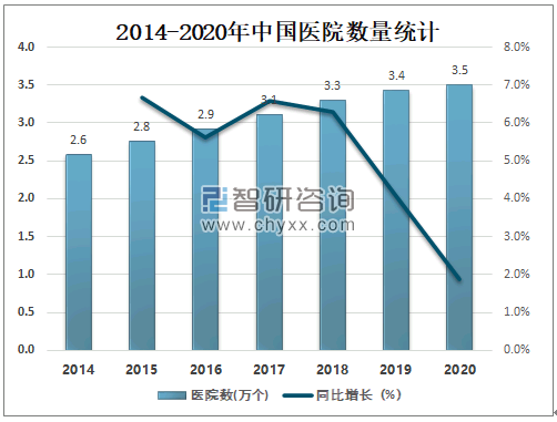 智研咨询发布的《2021-2027年中国医院行业市场行情动态及发展前景展望报告》数据显示:我国是最早设置医院的国家之一,近年来中国医院数量逐年增加,2020年中国医院数量达3.5万个,较2019年增加了0.06万个,同比增长1.9%。